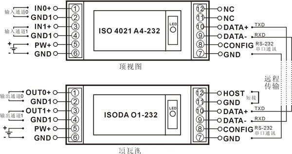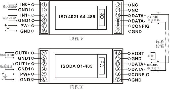 ISO DAO模塊可以通過短接HOST端到GND端(即11腳和12腳短接)設置成主機模式,與ISO 4021模塊的通訊接口相連接,并將ISO 4021模塊設置為Modbus通訊方式,就可以實現將ISO 4021的兩通道輸入信號對應在ISO DAO模塊的兩個輸出通道里輸出。該模式主要用于模擬信號的數字化遠程傳輸與還原,在信號的光纖傳輸,GSM、CDMA無線傳輸,以太網傳輸等領域得到廣泛應用。