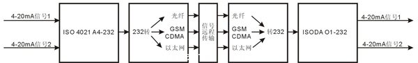 4-20mA模擬信號在工業現場應用廣泛,下面以4-20mA信號為例,實現遠程傳輸與還原。4-20mA模擬信號進入ISO 4021 A4-232模塊后轉換成數字量,通過RS-232接口,連接到RS-232轉光纖轉換器,或者RS-232轉GSM/CDMA轉換器,或者RS-232轉以太網轉換器,再通過光纖,或者GSM/CDMA,或者以太網遠程傳輸,在接收端再用相應的RS-232轉光纖轉換器,或者RS-232轉GSM/CDMA轉換器,或者RS-232轉以太網轉換器,將信號轉換成RS-232信號。RS-232信號輸出到ISODA O1-232模塊的RS-232接口,最后ISODA O1-232模塊輸出4-20mA的模擬信號,完成了遠程傳輸功能。