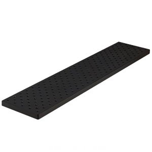 這種實心鋁質的狹長形面包板是由1/2英寸(12.7毫米)厚的鋁質平板制成,在整個長度上保持平整度,提供雙倍密度的1/2英寸(12.5毫米)孔距布局。這種狹長的結構適合緊湊的區域,通過加倍安裝面上的螺紋孔數量增加了安裝的多樣性。由于這些螺紋孔貫穿整個底板,組件可安裝在面包板兩側。通過帶支座的接桿可將面包板安裝到光學平臺之上,從而允許操作面包板兩側的組件。
