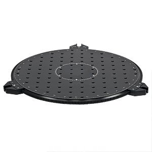 Thorlabs大面積旋轉平臺為某些光學組件需要角度調節的應用而設計。面包板中間有一個Ø3.84英寸(Ø97.5毫米)的可拆除圓片,方便將其他元件放置在中間,此時面包板繞著中心的元件旋轉。該平臺的特點是采用三點可調安裝系統,使用燕尾定位實現準確的位置調整;其中一個安裝位采用了正齒輪調整,另兩個安裝位采用鎖定螺絲。靠近旋轉轉盤的安裝位有槽,能把面包板固定到標準的光學平臺或者面包板上;這些槽的位置可以調整,以便避開安裝在附近的設備。
