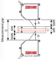 在被測體上方和下方各安裝一個激光位移傳感器,被測體厚度D=C-(A+B)。其中,C是兩個傳感器之間距離,A是上面傳感器到被測體之間距離,B是下面傳感器到被測體之間距離。圖中:SMR是指傳感器量程起始間距,MR是指傳感器量程。