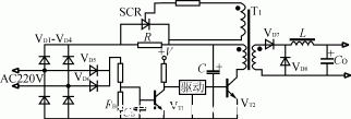 該電路如圖3所示。在電源瞬時接通時,輸入電壓經整流橋VD1VD4和限流電阻R對電容器C充電。當電容器C充電到約80%的額定電壓時,逆變器正常工作,經主變壓器輔助繞組產生晶閘管的觸發信號,使晶閘管導通并短路限流電阻R,開關電源處于正常運行狀態。