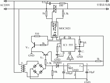 該電路如圖7所示。集成穩壓器輸出穩定的5V電壓,為軟起動電路提供電源電壓。晶體管VT1、反相器IC2構成過零觸發電路,IC1555構成單穩態觸發器,R1、C1為定時周期,但因5端至1端接有延遲電路R2、C2,所以555是逐步達到滿周期的。當電網電壓過零時,晶體管VT1截止,反相器IC2輸出低電平,起動定時電路555工作,軟起動延遲時間由時間常數R1C1及R2C2共同決定。