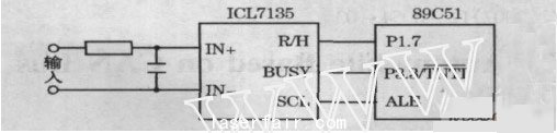 ICL7135的時(shí)鐘由下位單片機(jī)的ALE 端提供,因?yàn)橄挛粰C(jī)在P0、P2 口沒有擴(kuò)展外圍程序存儲(chǔ)器和數(shù)據(jù)存儲(chǔ)器,因此端提供的時(shí)鐘頻率為系統(tǒng)時(shí)鐘頻率的1/ 12 ;此外,由于前級(jí)放大部分采用AD620 ,它是雙電源供電,所以ICL7135 也是雙電源供電,且他們的電源要求相同。ICL7135 和下位單片機(jī)的連接采用串行連接,如圖5 所示。
