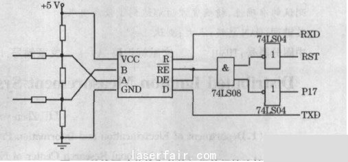 總線驅(qū)動(dòng)芯片選用RS - 485 接口芯片SN75LBC184 ,它采用單一電源,電壓為3~515 V 時(shí)都能正常工作。與普通的芯片相比,它不但能抗雷電的沖擊,而且能承受高達(dá)的靜電放電沖擊,片內(nèi)集成4 個(gè)瞬時(shí)過壓保護(hù)管,可承受高達(dá)的瞬態(tài)脈沖電壓,因此它能顯著提高防止雷電損壞器件的可靠性。對(duì)一些環(huán)境比較惡劣的現(xiàn)場(chǎng),可直接與傳輸線相接,而不需要任何外加保護(hù)元件。該芯片還有一個(gè)獨(dú)特的設(shè)計(jì),當(dāng)輸入端開路時(shí),其輸出為高電平,這樣可保證接收器輸入端電纜有開路故障時(shí),不影響系統(tǒng)的正常工作。另外它的輸入阻抗為RS - 485 標(biāo)準(zhǔn)輸入阻抗的2 倍( ≥24 kΩ) ,故可以在總線上連接64 個(gè)收發(fā)器。芯片內(nèi)部設(shè)計(jì)了限斜率驅(qū)動(dòng),使輸出信號(hào)邊沿不會(huì)過陡,使傳輸線上不會(huì)產(chǎn)生過多的高頻分量,從而有效扼制電磁干擾。總線驅(qū)動(dòng)芯片和單片機(jī)的連接采用間接連接,如圖7 所示。