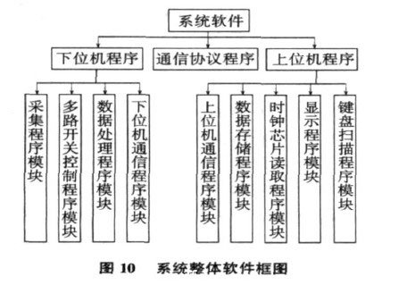系統(tǒng)軟件框圖如圖10 所示。一級(jí)目錄分為上位機(jī)程序、通信程序和下位機(jī)程序;二級(jí)目錄分為數(shù)據(jù)采集程序模塊、模擬多路開關(guān)控制程序模塊、數(shù)據(jù)處理程序模塊、下位機(jī)通信程序模塊、上位機(jī)通信程序模塊、顯示程序模塊、存儲(chǔ)程序模塊、時(shí)鐘程序模塊以及鍵盤控制模塊。每個(gè)二級(jí)程序模塊又由更小的函數(shù)組成,這樣的設(shè)計(jì)方法容易修改和測(cè)試。