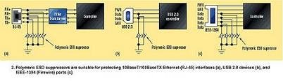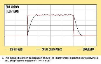 另外,許多新型消費電子器件能執行快速的IEEE-1394/1394b(Fireware)數據轉換協議。這種非常高的數據速率(1600 Mbps,1394b)要求低電容ESD抑制器,例如聚合物浪涌器件。測試數據表明,聚合物ESD抑制器帶來的信號失真比硅二極管器件保護Firewire端口產生的更少。