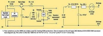 最流行的HBM變種是國際電工委員會IEC1000-4-2標準,定義為150pF電容通過一個330Ω電阻放電(圖1b)。這是歐盟對在其區域內商品銷售所必須的國際測試。#p#分頁標題#e#
