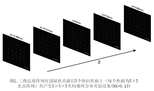 該課題組研究人員指出,結合這種達曼波帶片和另一個二維達曼光柵,可以在透鏡的后場實現按照規則晶格結構排布的聚焦光斑三維陣列,即三維達曼陣列。研究人員通過實驗,在一個NA0.13和一個NA0.66物鏡的聚焦后場分別實現了5×5×5和6×6×7聚焦光斑陣列。這種按照規則晶格結構排布的三維達曼陣列在三維激光直寫光刻、三維光存儲、并行光學粒子操控等方面有廣泛的應用前景。