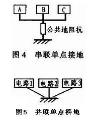 消除公共阻抗耦合的途徑有兩個,一個是減小公共地線部分的阻抗,這樣公共地線上的電壓也隨之減小,從而控制公共阻抗耦合。另一個方法是通過適當的接地方式避免容易相互干擾的電路共用地線,一般要避免強電電路與弱電電路共用地線,數字電路與模擬電路共用地線等。并聯接地的缺點是接地的導線過多。因此在實際中,沒有必要所有電路都并聯單點接地,對于相互干擾較少的電路,可以采用串聯單點接地。例如,可以將電路按照強信號,弱信號,模擬信號,數字信號等分類,然后在同類電路內部用串聯單點接地,如圖4所示,不同類型的電路采用并聯單點接地,如圖5所示。當信號頻率低于1 MHz時可采用單點接地的方法,使其不形成回路。信號頻率高于10 MHz時最好采用多點接地,盡量降低地線阻抗。電源線與地線應盡量靠近走線以減少所包圍的環路面積,從而減少外界磁場對環路切割產生的電場干擾,同時也減少環路對外電磁輻射。