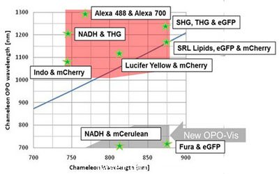 隨著緊湊型光學參量振蕩器的不斷發展,如相干公司的ChameleonCompactOPO,人們對使用波長大于1080nm激光的興趣也在不斷增加。通過使用集成式控制器即可輕松將波長調諧至1600nm,操作非常簡便。此外,使用可選的fan-poledOPO晶體,可以讓鈦寶石激光器和OPO在不改變光束指向的條件下實現獨立調諧,這對于多模式成像是非常理想的。現在又增加了一個將OPO輸出倍頻得到可見光的選項,進一步增加了多模式成像的選擇(見圖3)。