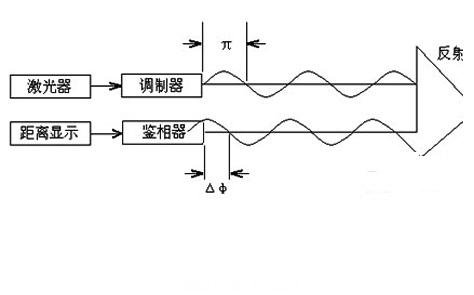相位式激光測距儀是用無線電波段的頻率,對激光束進行幅度調制并測定調制光往返測線一次所產生的相位延遲,再根據調制光的波長,換算此相位延遲所代表的距離。即用間接方法測定出光經往返測線所需的時間,如下圖所示。