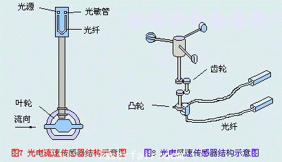 圖8示出,風帶動風速計旋轉,經(jīng)齒輪傳動后帶動凸輪成比例旋轉。光纖被徒輪輪番遮斷形成一串光脈沖,經(jīng)光電管轉換成定信號,經(jīng)計算可檢測出風速。