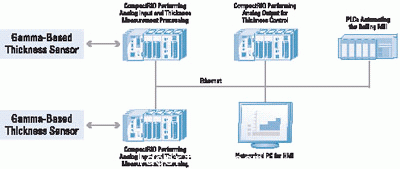 每個軋制機器都帶有三個形成網絡的CompactRIO系統。這三個系統都是智能節點,能利用一個工業標準Modbus/TCP、TCP/IP或UDP協議進行通信。其中有兩個系統與伽馬級傳感器連接,并進行模擬輸入測量和高級處理,來計算精確厚度測量值。
