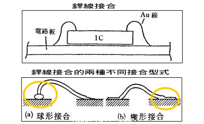 焊線接合首先將芯片固定在合適的基板或導線架(Lead Frame)上,再以細金屬線,將芯片上的電路與基板或導線架上的電路相連接如圖所示。