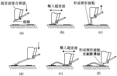 第二種壓焊方法是楔形制程,這種制程主要使用鋁線,但也可用金線,通常都在室溫下進行。楔焊將兩個楔形焊點壓下形成連接,在這種制程中沒有球形成。鋁線焊接制程被歸為超聲波線焊,形成焊點只用到超聲波能、壓力以及時間等參數。