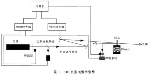 在ARS測量裝置中,通常以樣品為中心,光電探測器圍繞樣品在入射平面內作接近180°或360°的轉動,從而測得非入射平面內的散射光。樣品一般能轉動和平動,以測量斜入射下的散射特性和掃描樣品上各點的散射系數。在測量中,散射信號很小,通常要采用鎖相放大器。此外,由于測量數據很多,所以常常采用計算機進行自動采集和分析數據。圖1即為一種典型的角分辨散射測量儀器。