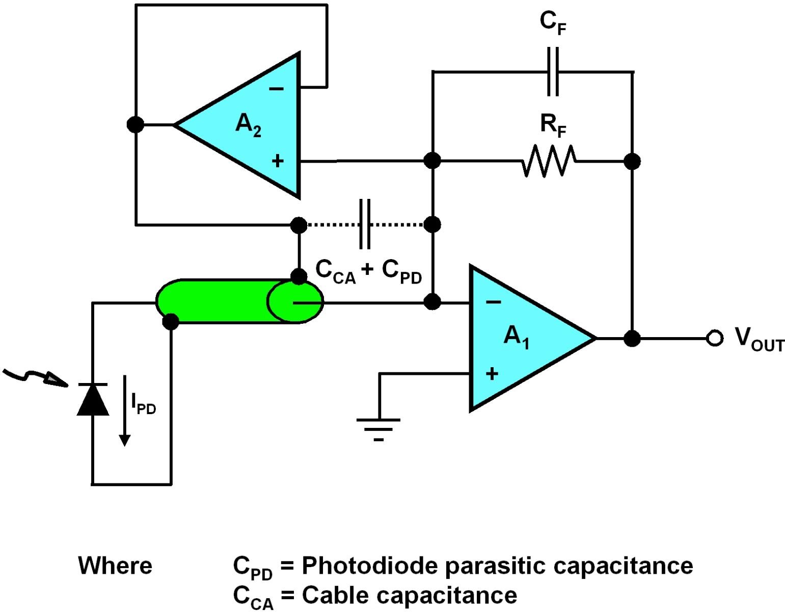 要解決這一問(wèn)題,您可以使用一個(gè)自舉電路(請(qǐng)參見(jiàn)圖1)。具有較低二極管電容的光電二極管并不會(huì)從該電路中受益。單位增益緩沖器A2去除了線纜電容以及跨阻抗放大器A1 輸入產(chǎn)生的光電二極管寄生電容。