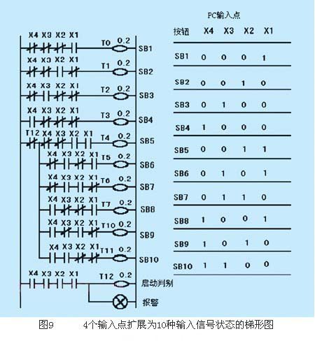 對于直流輸入模塊,采用雙常開按鈕的編程技巧,輸入點可在一定程度上得到擴展。例如,利用圖9所示的梯形圖可把4個輸入點擴展為10種輸入信號狀態(tài)。圖9中直流輸入模塊的x1、x2、x3、x4均接入常開按鈕,利用這4個按鈕的不同狀態(tài)組合可表示10種輸入信號。如假設(shè)圖9中的第一個邏輯行表示正向起動,第二個邏輯行表示反向起動,第三個邏輯行表示總停止等等。