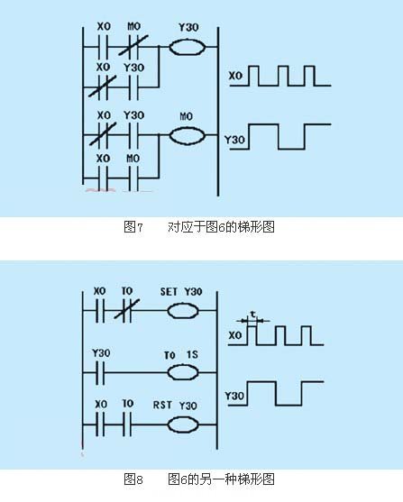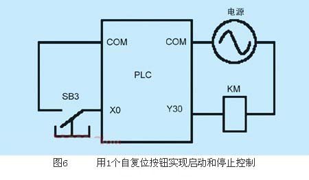 一般情況下,plc控制的外部設(shè)備至少要有1個起動按鈕和1個總停止按鈕作為輸入信號,來控制程序的運行和停止,因此至少需要2個輸入點。當(dāng)輸入的總點數(shù)緊張時,也可用1個自復(fù)位按鈕sb3實現(xiàn)起動和停止兩種控制,其輸入接線如圖6所示,相應(yīng)的梯形圖可采用圖7或圖8所示的兩種設(shè)計方法。圖7中的m0為內(nèi)部繼電器,作中間環(huán)節(jié)使用。圖8中采用了置位、復(fù)位指令及定時器t0來完成單按鈕實現(xiàn)起動和停止的功能。采用圖8所示的梯形圖時,應(yīng)注意t0的設(shè)定值應(yīng)大于按鈕x0按住的時間t。