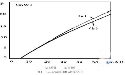 由圖2所測(cè)的光譜特性可以看到,在較低的工作電流下,激光器是單模工作的,但在工作電流加倍后,光譜變成雙模了,在主模長(zhǎng)波一側(cè)出現(xiàn)了強(qiáng)邊模。我們知道,對(duì)于DFB激光器一個(gè)端面鍍高反射膜,另一端面鍍得到低剩余反射率的增透膜,是一種優(yōu)選的結(jié)構(gòu)。這種結(jié)構(gòu)能使激光器獲得較高的模式選擇性及較高的單模成品率,具有良好的外微分量子效率,并對(duì)反射是相當(dāng)不敏感的。對(duì)于電流增加后出現(xiàn)的現(xiàn)象,一種可能是端面相位不匹配所致。激光器的光柵周期是相當(dāng)小的,蕊片之間有較大相移是可能的。另一種可能是鍍過(guò)增透膜后的剩余反射率還不夠低,以致還不足以破壞增益選擇性的對(duì)稱(chēng)性。