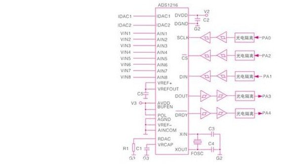 ads1216組成4路全差分通道。單片機(jī)通過porta與ads1216通信,用于控制ads1216選通某一路模擬量輸入通道并進(jìn)行采樣,每一個(gè)控制信號均通過光耦合器和兩個(gè)施密特觸發(fā)器進(jìn)行數(shù)字隔離,這樣做可有效抑制各種噪聲干擾,提高傳輸通道上的信噪比。ads1216采樣每一路通道之前均進(jìn)行偏置與增益自校準(zhǔn)。當(dāng)/drdy變?yōu)榈碗娖?,?biāo)志著數(shù)據(jù)寄存器中數(shù)據(jù)已準(zhǔn)備好,單片機(jī)便從24位數(shù)據(jù)輸出寄存器(dor)讀取轉(zhuǎn)換結(jié)果。