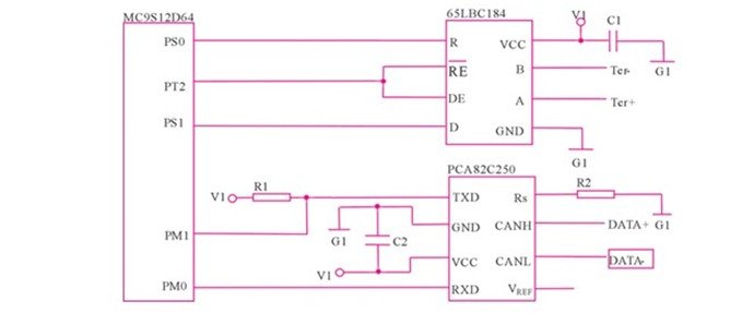 mc9s12d64單片機(jī)的can輸入與輸出引腳(rxcan0和txcan0)分別接至收發(fā)器pca82c250的txd和rxd引腳。pt2用來控制數(shù)據(jù)接收與發(fā)送,當(dāng)pt2為低電平時(shí),接收數(shù)據(jù);當(dāng)pt2為高電平時(shí),發(fā)送數(shù)據(jù)。輸入rs通過一電阻接地,使pca82c250工作在斜率控制模式下。sn65lbc184為具有瞬變電壓抑制的rs485差分收發(fā)器,因此本智能節(jié)點(diǎn)可以接入采用canbus或rs485的測控系統(tǒng),并方便的與各種組態(tài)軟件進(jìn)行通信。