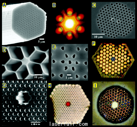 這種被談論著的光纖通常稱之為光子晶體光纖(PCFs),這種新型光波導可方便地分為兩個截然不同的群體。第一種光纖具有高折射率芯層(一般是固體硅),并被二維光子晶體包層所包圍的結構。這些光纖有類似于常規光纖的性質,其工作原理是由內部全反射(TIR)形成波導;相比于傳統的折射率傳導,光子晶體包層的有效折射率允許芯層有更高的折射率。因此,重要的是要注意到,這些我們所謂的內部全反射光子晶體光纖(TIR-PCFs) ,實際上完全不依賴于光子帶隙(PBG)效應。與TIR-PCFs截然不同的另一種光纖,其光子晶體包層顯示的是光子帶隙效應,它利用這種效應把光束控制在芯層內。這些光纖(PBG-PCFs)表現出可觀的性能,其中最重要的是能力控制和引導光束在具有比包層折射率低的芯層內傳播。相比而言,內部全反射光子晶體光纖(TIR-PCFs)首先是被制造出來的,而真正的光子帶隙傳導光纖(PBG-PCFs)只是在近期才得到實驗證明。