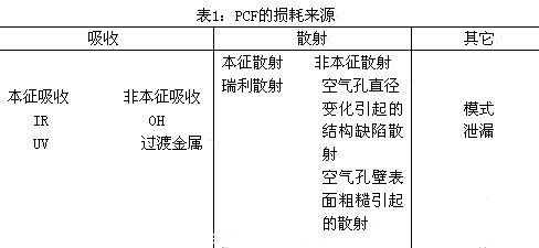 眾所周知,作為光信號傳輸介質,無論是G.652光纖還是PCF都應該滿足低損耗、小色散和低非線性效應。與G.652損耗機理相同,PCF損耗主要來源于吸收和散射。此外,由于PCF結構的特殊性,也自然帶來了一些特殊的損耗來源,如模式泄漏損耗和結構缺陷損耗。表1給出了PCF的損耗來源。