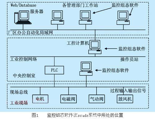 在一個自動監(jiān)控(supervisory control and data acquisitionscada)系統(tǒng)中,投入運行的監(jiān)控組態(tài)軟件是系統(tǒng)的數(shù)據(jù)采集和處理中心、遠(yuǎn)程監(jiān)控中心和數(shù)據(jù)轉(zhuǎn)發(fā)中心。處于運行狀態(tài)的監(jiān)控組態(tài)軟件與各種控制、檢測設(shè)備如掛接在現(xiàn)場總線上的工控計算機、plc、智能儀表、智能設(shè)備等共同構(gòu)成快速響應(yīng)控制中心??刂品桨负退惴ㄒ话阍谠O(shè)備上組態(tài)并執(zhí)行,也可在工控計算機上組態(tài),然后在下裝到設(shè)備中執(zhí)行,根據(jù)設(shè)備的具體要求而定[1]。組態(tài)軟件在scada系統(tǒng)中所處的位置如圖1所示。