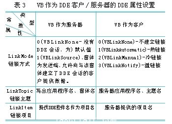 在利用vb開發dde客戶/服務器應用程序中,欲建立dde鏈接,完全依賴對象的dde屬性設置。vb分別作為dde客戶和dde服務器時,dde屬性的不同設置(見表3)。