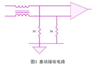 為方便通訊,驅動單元都留有rs232或rs485接口,為此,設計中接口電路需進行濾波處理。通常采用差動線路驅動和接收的方法來提高線路接口的抗擾度。低于信號電平并加在非畸變信號上的噪聲脈沖電壓與疊加在畸變信號上的噪聲脈沖相比,不可能超過接收器輸入端的開關閾值,因此在接收器輸入端加端接電阻可以減少反射并改善信號質量和提高電路接口抗擾性。差動接收電路如圖3。
