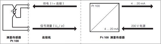 溫度的測量是通過測量電阻來確定的。Pt 100電阻溫度計在0 °C時的電阻為100 Ω。此值會隨溫度而改變,其變動大約為0.4 Ω/K。為了測量溫度,施加了一個恒定的獨立電流源(測量電流),它在電阻溫度計上產生電壓降和溫度成正比。為了防止電阻溫度計由于測量電流而引起自身發熱,測量電流被限制為1 mA。在這種情況下,0 °C時Pt 100上的電壓降為100 mV。這個現場測量值必須被傳送到顯示器或處理器。在Pt 100測量傳感器到測量轉換器的各種連接方式中,四線連接是其中的一種典型、最佳連接方式。通過這種接線,排除了導電電阻及其溫度波動對測量結果的干擾。Pt 100電阻溫度計由外部電源供電。導電電阻的變化可由電源電壓的調節自動補償。如果導電電阻不變,則測量得到的電壓Um也保持不變。這些測量電壓,僅隨溫度引起的電阻變化而改變,并在測量轉換器的高電阻轉換裝置處獲得其測量值。因此,在此連接方式中沒有必要使用線補償。