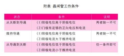 由于晶閘管只有導通和關斷兩種工作狀態,所以它具有開關特性,這種特性需要一定的條件才能轉化,此條件如附表所示。
