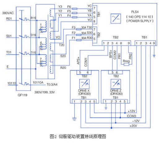 原輸入380v交流電壓,通過變壓器轉換輸出199v和33v給驅動器電源,再由驅動器電源轉換輸出正/負12v和20v電壓給驅動器,還有24v電壓開關量信號,最后連接到電機輸出380v交流電壓。可見其電壓等級繁多,設備復雜。改進后的控制系統僅輸入380v交流電壓,進入驅動器后直接輸出380v交流電壓,外部接線十分簡單明了,少了很多轉換設備,而且驅動器具有電機特性參數存儲功能。