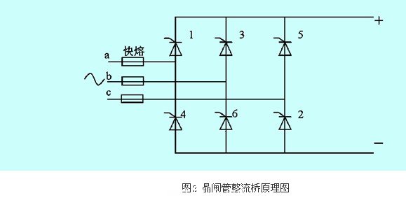 對(duì)降壓變壓器、晶閘管進(jìn)行檢查,發(fā)現(xiàn)軟起動(dòng)裝置整流橋1#晶閘管短路,整流橋原理圖如圖2所示。