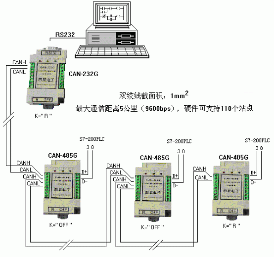 通信線的截面積比RS485通信線大,應(yīng)選1mm2的雙絞線,由于CAN-485G和CAN-232G(接電腦的RS232口)設(shè)計(jì)有二對(duì)總線端子,按圖所示接線也就不存在分支線問(wèn)題了。