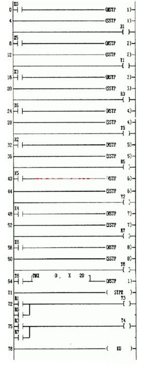 從機械手動作流程圖可以看出,這個控制任務每個循環的工作可以劃分為八步,其中第1步與第5步動作相同,均為上升;第3步和第7步動作相同,均為下降。在利用步進指令進行編程時,這兩個工步所對應的程序段的輸出不能直接設置為Y3、Y4,同一個輸出使用兩次則會出現語法錯誤。這時應考慮使用用于存儲中間狀態的內部通用繼電器Rn來解決這個問題。如圖7所示梯形圖程序,其中R1、R5分別被定義為第1步與第5步的輸出,R3、R7分別被定義為第3步與第7步的輸出,在步進結束后再將R1、R5的狀態輸出到上升Y3,將R3、R7的狀態輸出到下降Y4,通過這樣的方法可方便解決順序控制任務中若干工步輸出相同的問題。