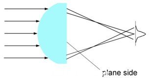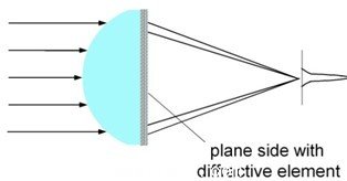 常規的平凸透鏡會產生不同位置的入射光焦點不一的問題。采用衍射校正透鏡,是在常規平凸透鏡的平面端刻蝕像差校正的衍射微結構,從而達到整個入射光的焦點歸一,提高激光效率。