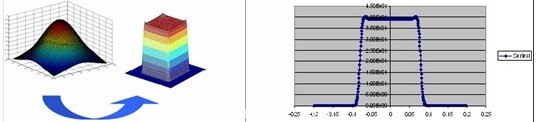 衍射平頂光束整形元件用于將一個高斯入射光變為強度均勻的平頂光束,具有很銳利的邊緣,可以是圓形或方形。主要的應用包括激光燒蝕、激光焊接、激光打孔、激光顯示器、激光醫學及激光醫療等。