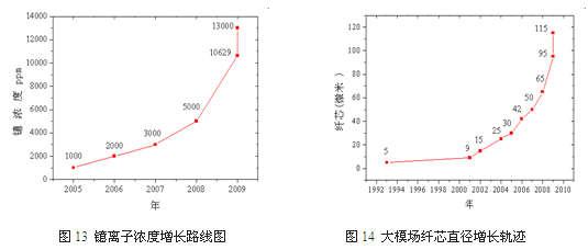 烽火通信采用自主知識產權的專利技術,實現了稀土離子摻雜技術突破,鐿離子濃度迅速突破13000ppm(見圖13所示),雙包層摻鐿光纖的纖芯直徑迅速突破100微米的技術關隘,達到115微米(見圖14所示)。