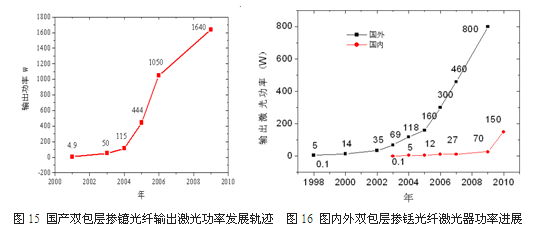 目前,烽火通信科技股份有限公司的單根摻鐿光纖成功實現1640W的1080nm的激光功率輸出(見圖15所示),這是國內特種光纖的首次技術突破,達到了當前國際先進水平,促進了我國國防科學技術的進步。