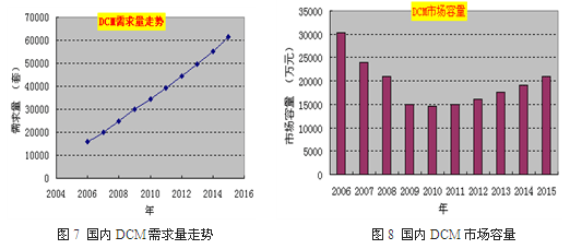 高速大容量光通信系統需求的寬帶色散補償光纖及其器件(DCM)成功商用,實現C波段的色散和色散斜率的雙功能補償,并且大規模應用在波分復用(WDM)及OTN光通信系統中,解決了該器件依賴于進口的局面。隨著密集波分系統的規模化建設,國內對色散補償光纖模塊的需求量迅速增長,預計到2015年國內需求將達到60000套(見圖7),市場容量將達到2.2億元(圖8)。