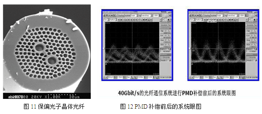 常規保偏光纖大多采用預制棒鉆孔的方法,然后置入應力硼棒,形成應力雙折射。光子晶體光纖科學技術的出現,為保偏光纖技術提供了新的途徑。目前,國外已經開始了光子晶體PMF的研究,利用氧化硅一空氣之間的折射率反差大,容易獲得高雙折射,研制出了保偏光子晶體光纖(PCF).英國巴斯大學報道了其研制的高雙折射PCF,利用相同直徑不同壁厚的毛細管組合成預制棒,實現不同的微孔直徑.光纖外直徑125μm、節距1.46μm、小孔直徑0.54μm、大孔直徑1.14μm、在1 550 nm 的拍長為410μm ,雙折射B =3.8 x 10^-3 ,約為目前熊貓型PMF的10倍.Theis P.hansen利用光子晶體光纖可以高設計自由度的優勢,在光纖中引入雙纖芯,微孔點陣呈現三角形點陣,研制的光子晶體PMF雙折射達到1.0x10^-3 .目前研制的光子晶體PMF在1 550 am 窗口的損耗為1.3 dB/km,并以10 Gbit/s的速率進行1.5 km的傳輸系統試驗。 烽火通信在國家科技計劃的支撐下開展了光子晶體保偏光纖的研究,制備出如圖11所示的保偏光子晶體光纖,其模雙折射B=3.1x10^-3。并進行了10G通信系統的PMD補償試驗研究:圖12中的左圖表示系統沒有進行PMD補償時的眼圖,系統的固定DGD為16ps,可以看出信號嚴重地受到系統PMD的影響而不能正常工作;采用圖11所示的保偏光子晶體光纖對系統進行PMD補償后,圖12中的右圖顯示通信系統的眼圖睜開,系統恢復正常工作。