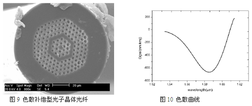 常規色散補償光纖模塊對G.652光纖的補償比率在1:8~1:10,如果采用光子晶體前沿技術進行補償,理論上可以達到1:100的補償比率,實現色散的高效補償。烽火通信在國家科技計劃的支撐下,研制出高負色散光子晶體光纖(見圖9)。該光纖測試的色散曲線見圖10所示,其峰值波長為1570nm,峰值負色散為-666.2ps/nm.km,其補償帶寬為40nm,補償比率3倍以上。