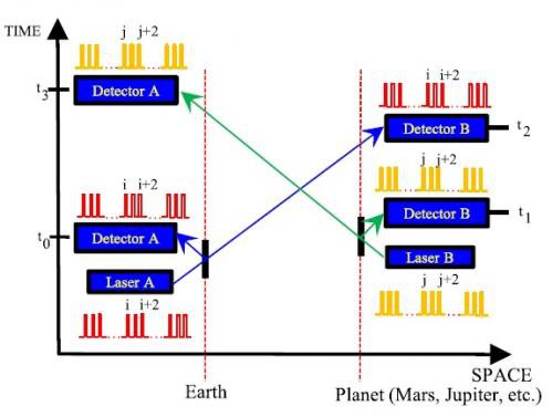 主動激光測距地球和行星之間的空間 - 時間圖。該系統收發器兩端均采用有源激光器,所以比無源收發器的信號更強,可以實現遠距離激光測距。
