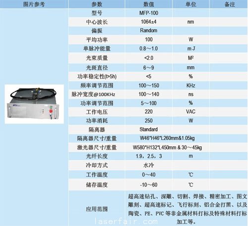 聲光調Q脈沖光纖激光器具有開機時間短,光脈沖窄,高峰值功率,重復頻率范圍寬等特點,極大滿足用戶的需求。創鑫激光采用最可靠的設計方案研制出了平均功率高達100W的聲光調Q脈沖光纖激光器。該激光器在激光關斷情況下無漏光,工作波長穩定在1064+4nm,功率可調范圍5%-100%,脈沖重復頻率100-----150KHZ,寬度可調范圍100ns-140ns,并實現高達10KW的峰值功率輸出,可用于鋁,銅,金,銀等反高材料上進行加工。此激光器結構緊湊,冷卻方式為水冷,可靠性強,使用壽命長,廣泛應用于超高速鉆孔、深雕、切割、焊接、精密加工、圖文雕刻、超高速標記、飛行標刻、非金屬材料打標及特殊材料打標加工等。