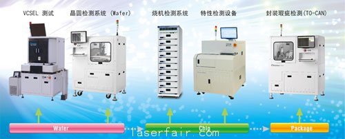 在晶圓(Wafer)檢測部分,致茂結合Prober-Station與TEC致冷芯片溫控器,可快速制造-40℃到150℃的環境,并確保在無冷凝的環境下測試雷射光電特性隨溫度變化的情形。于雷射芯片(Chip)檢測段,致茂將使用HOC共用載具(Hand-Over Carrier)的方式可于人員不直接接觸芯片下進行自動化光電特性量測L-I-V曲線與燒機測試的交互測試。而特性檢測Characterization上致茂提供的是Turn-Key解決方案, 整合性的測試可大幅降低人工需求進而達到客戶測試需求;今年致茂也針對TOCAN封裝段的激光器提出新的燒機檢測系統(Burn-In)與自動化光學檢測(AOI),可于最終出貨前進一步檢測出有瑕疵的激光器。
