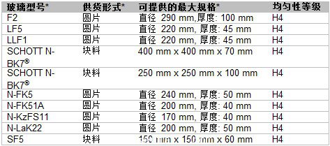 肖特先進光學目前擁有的材料庫存和可提供的最大規格如下: