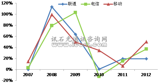 三大運營商2006-2012年光纖光纜需求量增長速度(%)